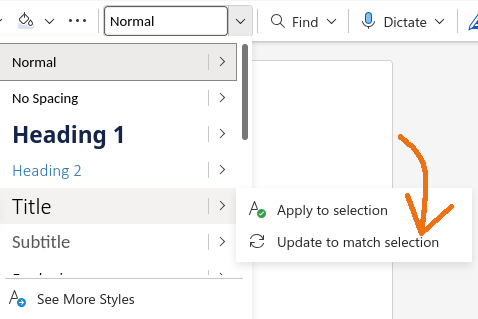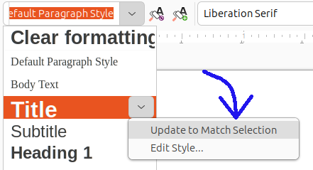 Now, and this is the real important part, we need to apply those changes to the document’s Styles. We will start again with the Title text. Place your cursor in the middle of the word, click the style dropdown menu, hover over Title, and select “Update to match selection”.